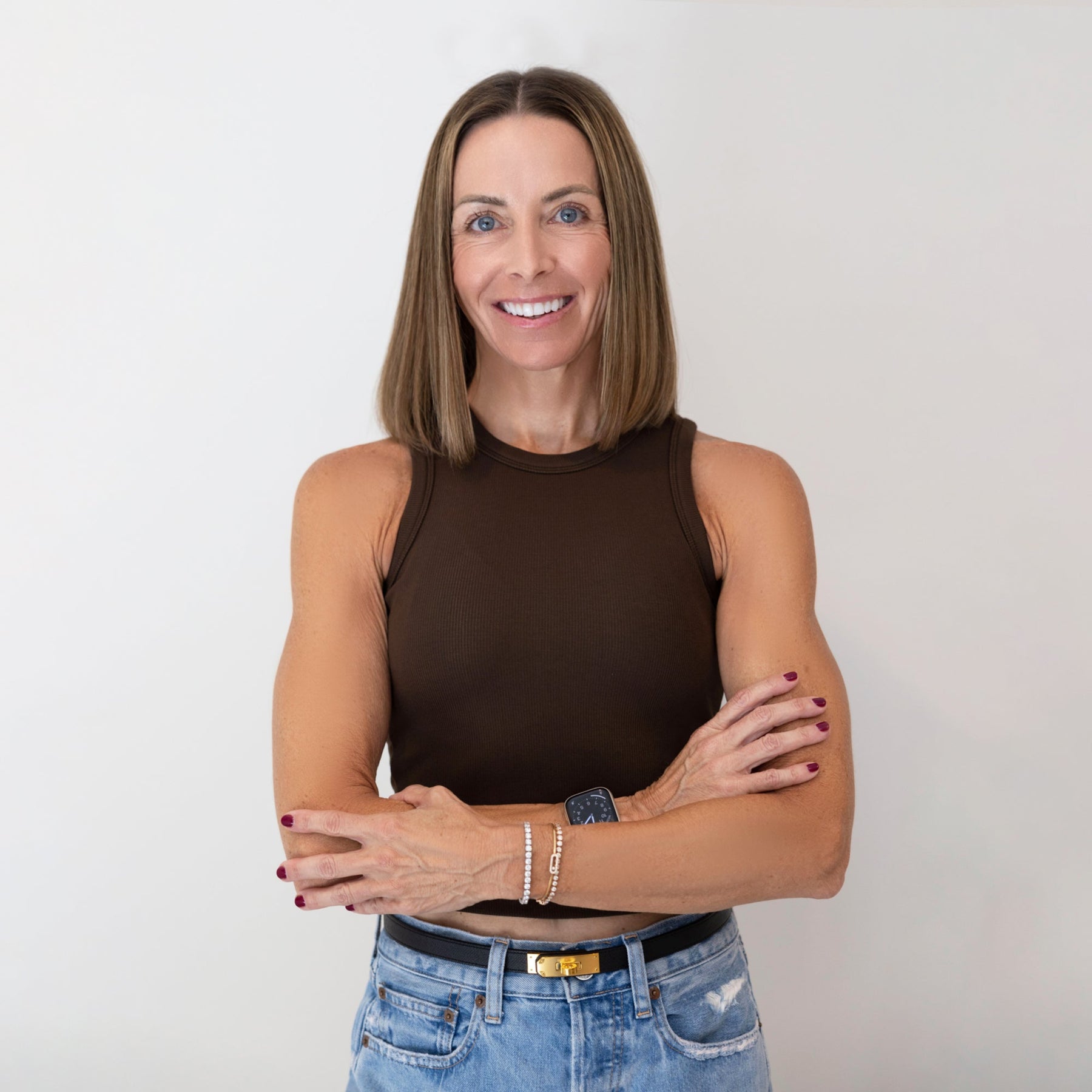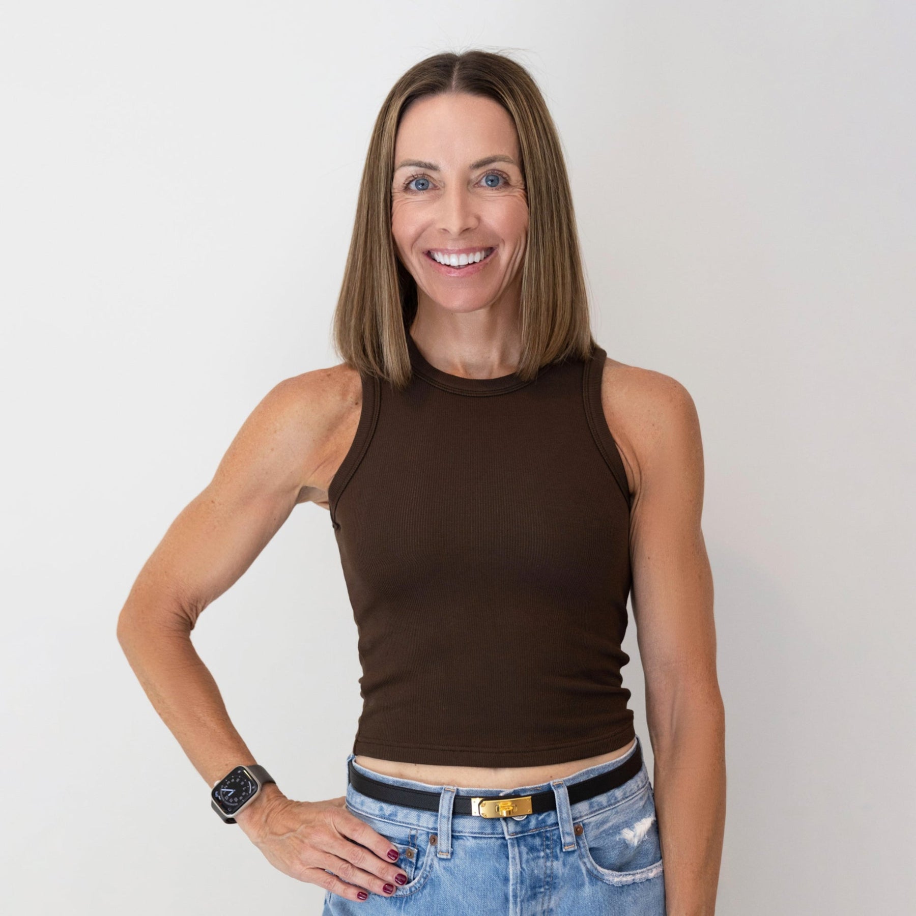 Person wearing a brown tank top with a logo on the back, standing against a plain background